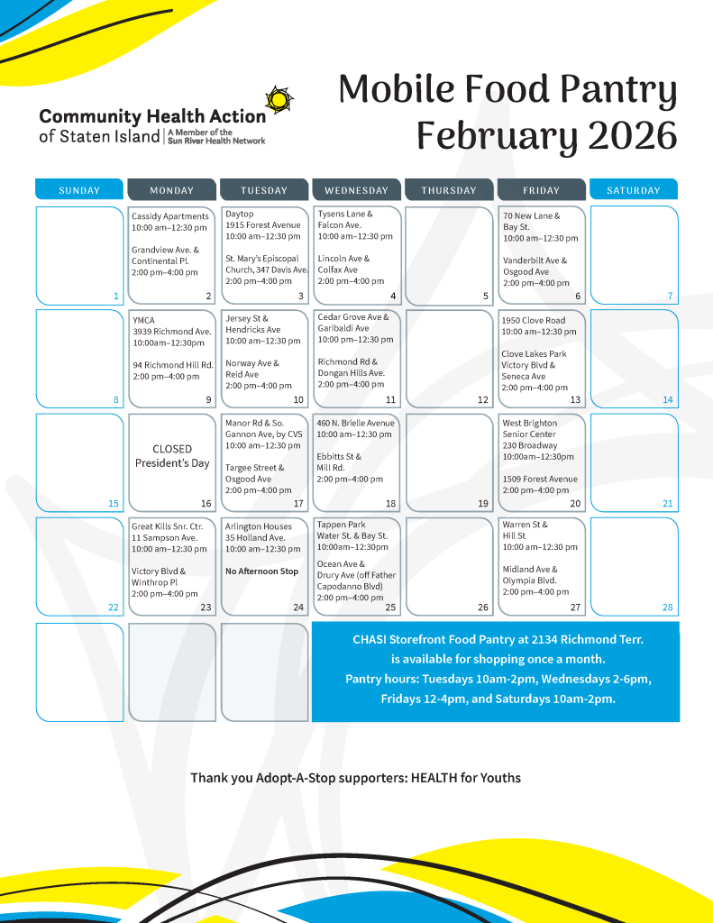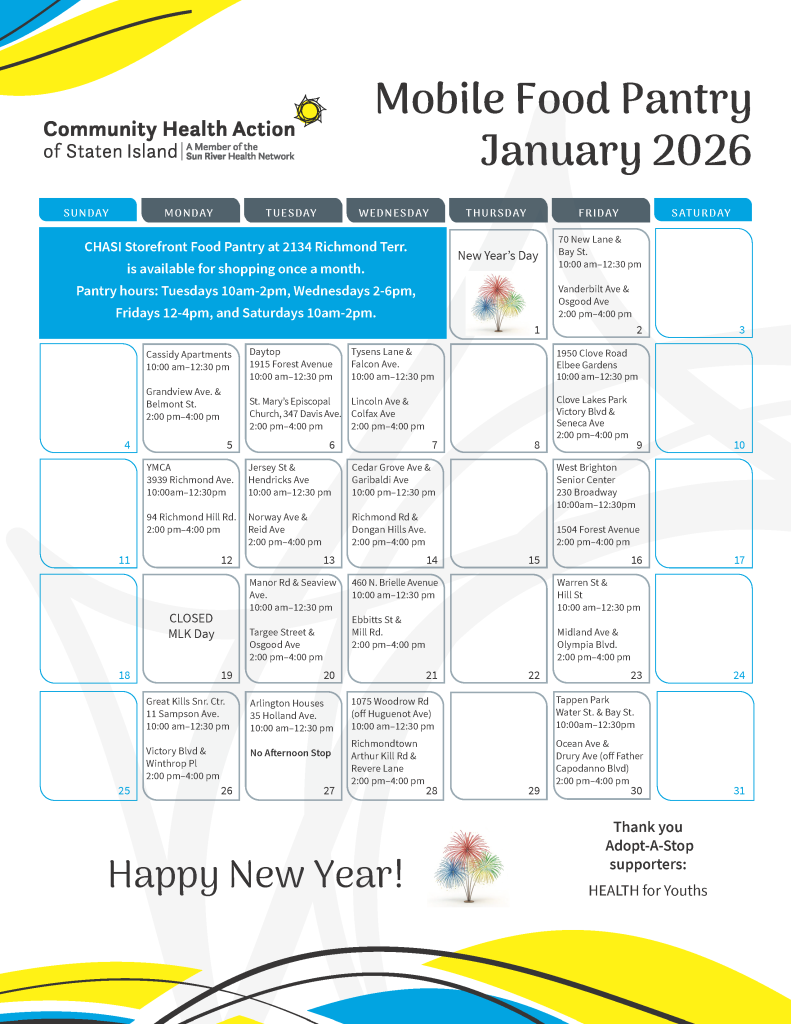 The CHASI Mobile Food Pantry visits over thirty neighborhoods across Staten Island, distributing free food four days each week.